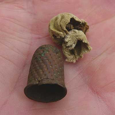En lisant ce post sympa de kimboo sur la vie de nos ancêtres, je me suis souvenu avoir trouvé la même chose... un à un, j'ai retourné tous mes dés, et le voilà ci-dessous avec deux bouts de tissus qui devaient caler le doigt de la repriseuse...