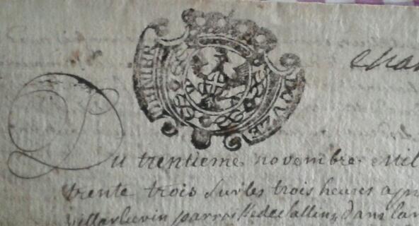 Avant la révolution française et sur le territoire français ces cachets s'appelaient des cachets de Généralités. Ils étaient apposés sur tous les documents notariés (chaque grande ville avait son propre cachet pour elle même et le territoire qui dépendait de cette ville) depuis les environs de 1680 jusqu'à la Révolution ou le système a changé. On retrouve ces cachets modifiés après la révolution jusqu'à l'avènement des timbres fiscaux sous le 2 eme empire . Chaque cachet représente la valeur attribuée au papier ou parchemin sur lequel est écrit l'acte notarié en fonction de sa taille et de sa nature(quart de feuille , demie-feuille , papier, parchemin etc...). Cela n'empêche pas le clerc de notaire de rajouter par écrit le coût de l'acte notarié en lui même (différent 'il s'agissait d'une reconnaissance de dette , d'un contrat de mariage , d'un testament....etc....)en général à la fin ou au dos de l'acte. Ces cachets de généralités sont donc considérés comme les ancêtres du timbre fiscal et postal .