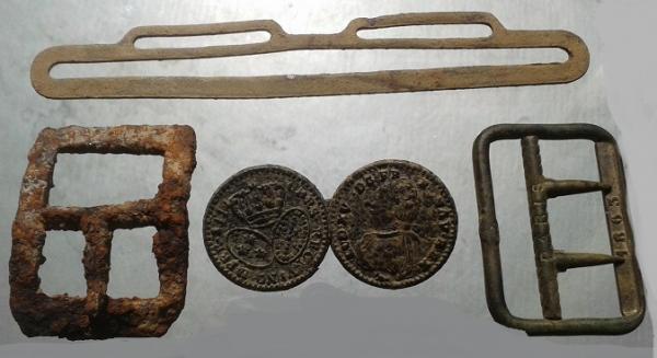Moi, cet après-midi : 2 balles de mousquet, un double-tournois de Louis XIII, un plomb de scellé et un bouton d'infanterie !