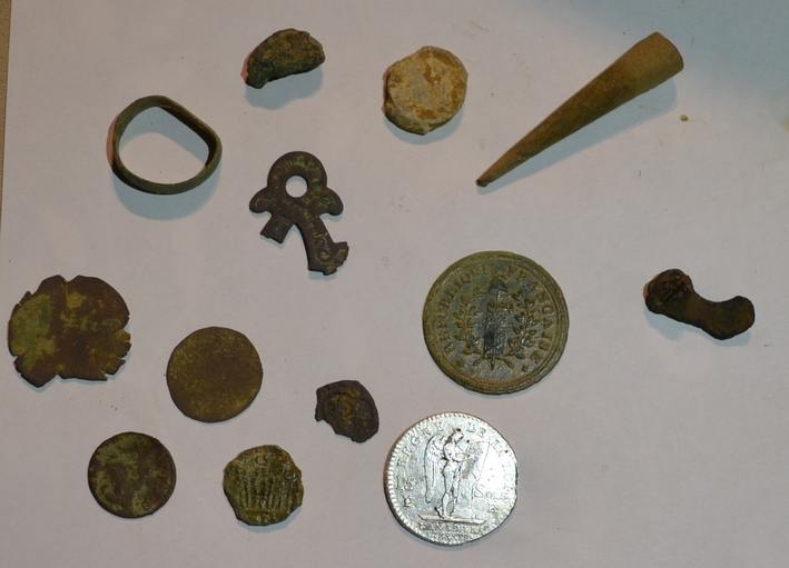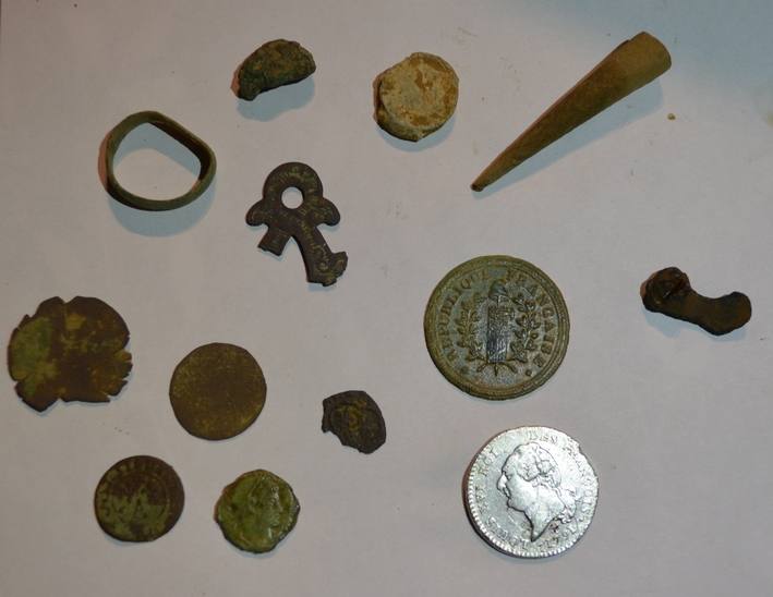 Pour info le bilan exact c'est : un denier tournoi 1631 / une petite monnaie cassée avec un trilobe dans lequel se trouve une fleur de lys et au revers un quadrilobe avec un H et d'autres motifs que je ne distingue pas bien / un 15 sols 1791 H / une petite romaine / 2 savos / un embout de fuseau qui s'avère être un peu décoré après nettoyage / une bague en cuivre tordue / un gros bouton révolutionnaire / un plomb de sac lisse / un petit objet décoré cassé / un reste de fibule ( )