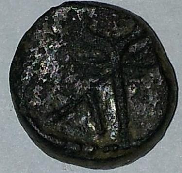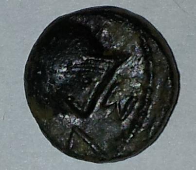 Sur cette face, on voit le caducée ailé, plus une marque en V (s'agit il de la lettre, ou bien d'une hache stylisée? La hache existe, bien dessinée, sur d'autres monnaies de la ville). .....