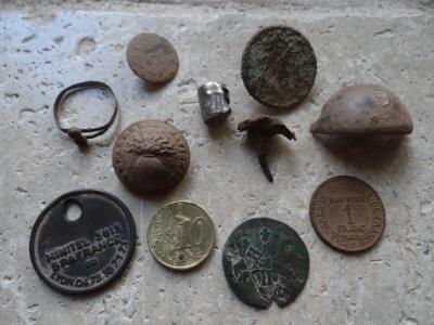 En haut Ă  gauche c'est une petite bague et au plus haut deux boutons,au millieu un bastos(cal 45 je pense)et Ă  droite un quart de grelot avec le chiffre 6.