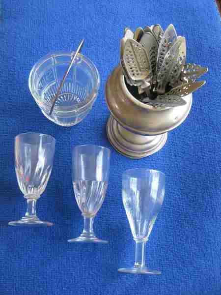 J'ai la bouteille, les cacahuètes, les verres,qui porte le sucre, l'eau fraiche pas de glaçon , ça trouble l'absinthe et puis une dose d'eau c'est une dose, le glaçon en fondant ça ''noie'' le breuvage