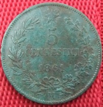 Le côté pile, où il est écrit ''5 centesimi'' au dessus de la date (1861) et d'un petit M (pour l'atelier de Milan) comporte un rameau d'olivier et un autre de chêne, ce qui n'est pas sans rappeler le revers des francs de Napoléon Ier.
