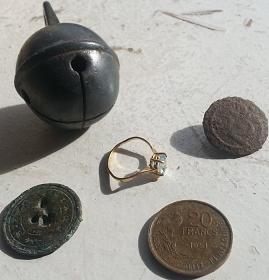 Donc : un grelot en metal de cloche de 55 gr (sans numéro), une 20 francs 1951 en plutot bon état, le classique bouton 1er empire (N°52), ce que j'ai d'abord pris pour un bouton (car 3 trous) mais reste inconnue à l'heure actuel (texte limite lisible) et enfin ma 1ere bagouse en or (1.5g, avec deux poinçons : tète d'aigle et losange) sertie d'une pierre Aigue Marine (je ferais confirmer par un bijoutier) de 8mm/4mm !!