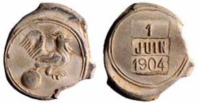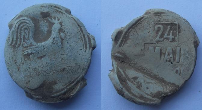 On peut y voir un magnifique coq sur une face, et l'autre face, je lis 24 mai 1818 ou 1888. Un doute sur la date car quasi totalement effacé.
