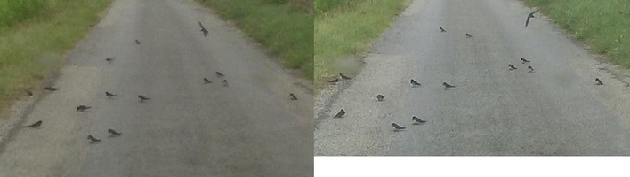 Sur un petit chemin j'ai eu la surprise de rencontrer un rassemblement d'hirondelles (environ une cinquantaine) qui se posaient sur la route et les clĂŽtures adjacentes.