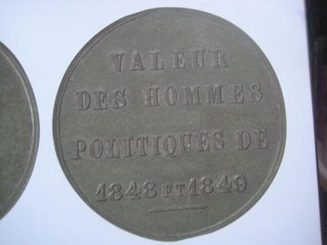 En fait il s'agit d'une monnaie de 0 francs de 1848 à 1849. Monnaie-médaille satirique, dont certains ont souhaité exprimer leur jugement sur la situation politique, il n'est pas brillant, la valeur attribué aux hommes politiques est sans appel : 0 Fr !