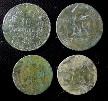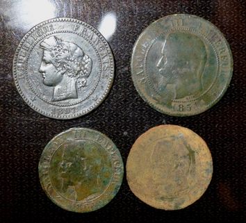 Résultat 4 monnaies à mes pieds : 10 centimes Napo 3 1854 W (usé), 10 centimes Cérès 1897 A (ttb) et deux 5 centimes Napo 3 (pas terrible).