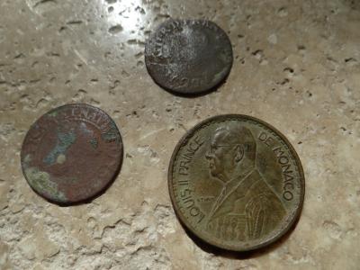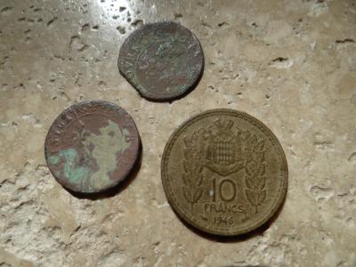 Aprés un long moment d'abstinance....voila le résultat d'une petite sortie avec cette jolie pièce de monaco et 2 dt (un de 1643).Petite surprise le dt était à 5 cm seulement de la pièce monégasque!!!