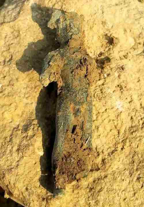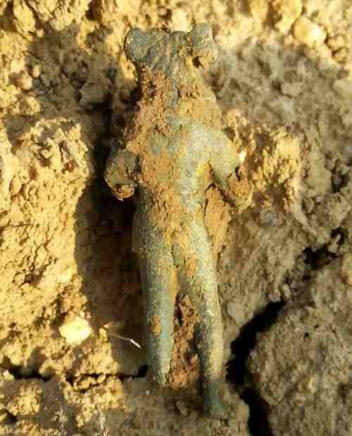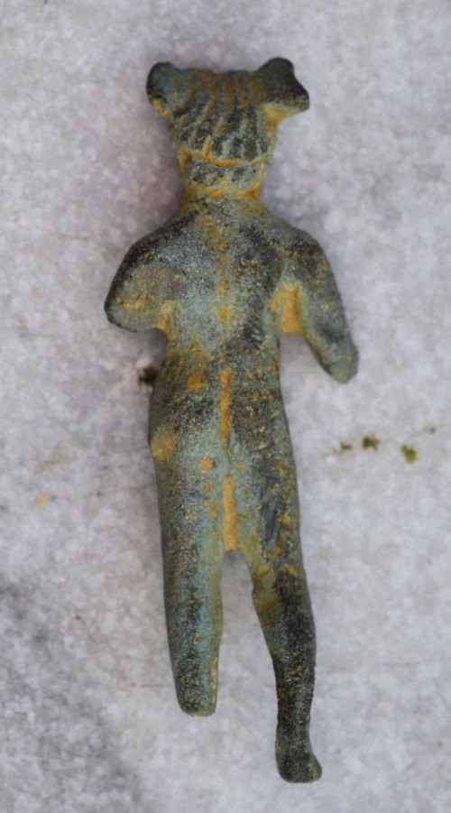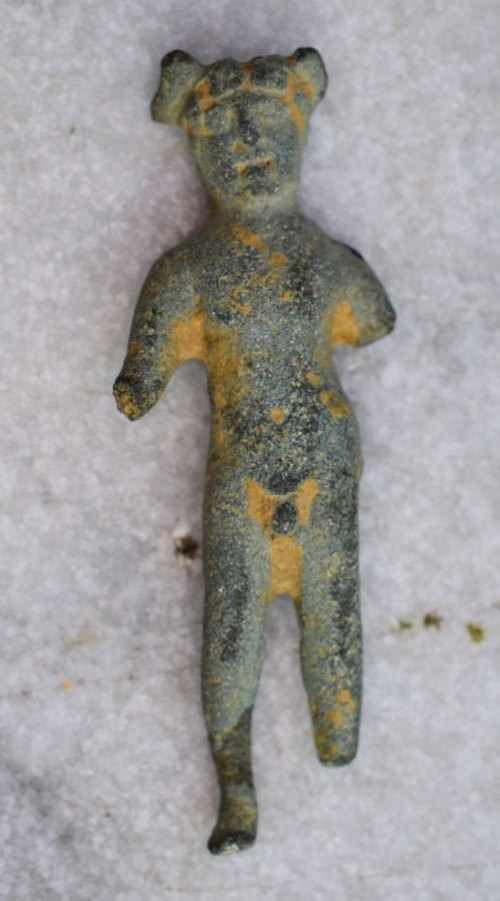 Bonjour les amis. Frisson énorme en plein soleil. Je sors du cabinet du cardiologue et hop là ! Pas bon pour le cœur une telle trouvaille. Le champ est immense, plusieurs dizaines d'hectares. Mon disque est tout petit, 22 cm. Pas un son pendant deux heures en deus fast de base, des canards de fer et c'est tout et pan ! le voilà qu'il se met à chanter le bougre, et quel chant ! . Il a morflé le dieu mais le voilà sauvé, c'est Mercure, dieu des voleurs. Cinq petits centimètres de haut.