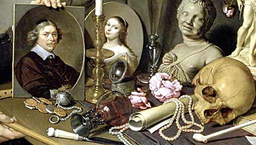 Un détail d'une peinture de David BAILLY, Autoportrait ou Vanité, Nature Morte avec portrait d’un jeune peintre, 1651, huile sur bois, 90 x 122cm,