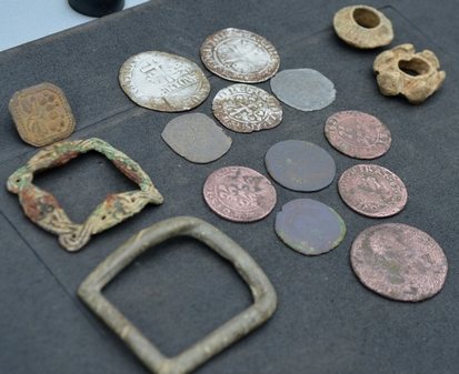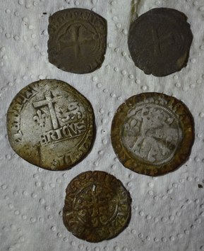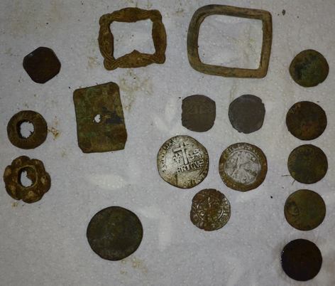 Bilan : 3 pièces en argent, 2 billons, 5 DT (qui ont l'air pas si mal), une romaine (très usée), 2 boucles dont une bien jolie, un bouton de cape (motif floral), 2 fusaïoles, une plaque de boucle médiévale je pense...