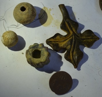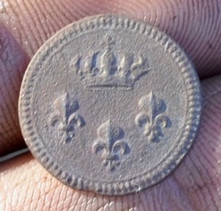J'ai eu la chance aussi de trouver un joli bouton avec 3 fleurs de lys couronnés, un petit objet crénelé avec des restes de dorure et de couleur et une sorte de pendant en bronze avec une très jolie patine (je le mettrais en identification).