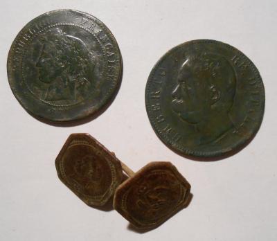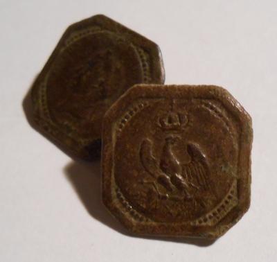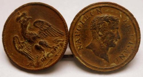 ces deux monnaies étaient à un mètre l'une de l'autre... et ce joli petit bouton de cape de Napoléon Empereur... . je me souviens pas en avoir vu dans la BDD...
