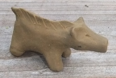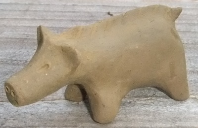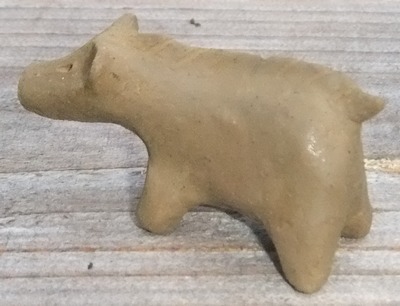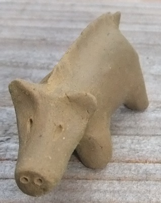 [1856] Ce qui est le plus dur, ce n'est pas le travail de la pâte à modeler (ça on sait le faire à trois ans et demi) mais bien sûr la cuisson ; c'est pourquoi j'ai décidé d'ignorer cette étape ce petit cochon va sécher au-dessus du poêle... j'espère qu'il va résister aux fissures !