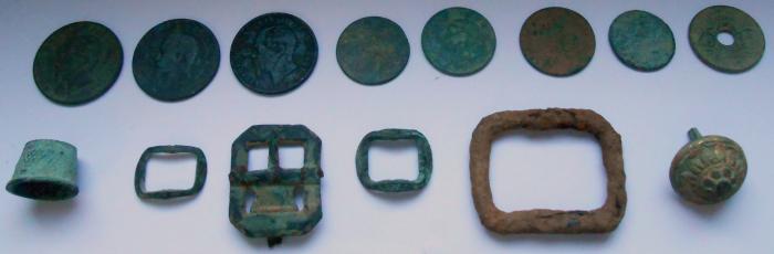 Des Napoléons 5 et 10 centimes, des Victor Emmanuel mais aussi des savonnettes, certaines pièces sont déjà nettoyées, d'autres en cours de grattage. Une 25 centimes percée 1920, un bague à coudre, un gros clou d'ameublement doré (c'est le deuxième que je trouve dans une vigne !!), des boucles de chaussures et vêtements.