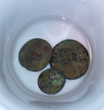 [19] Pour repondre à ta question, ce n'est pas facile... Il y a à mon avis 2 solutions, soit ta piece se creuse (dissolution de l'âme en cuivre de ta monnaie), soit elle s'en sort bien car la couche d'argent recouvre correctement l'ame de ta monnaie. En tout cas, j'eviterai de la plonger des heures dans une solution acide. Par contre, poser la piece sur un support plan, et deposer une ou plusieurs gouttes de vinaigres blanc sur les concrétions, laisser agir puis gratter au cure dent ou aiguille, ça peu très bien se faire. Cette technique peut etre longue mais avec de la patience elle donne de bons résultats (mon binome le Fredofly l'a déjà pratiqué avec succés). Bon courage