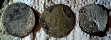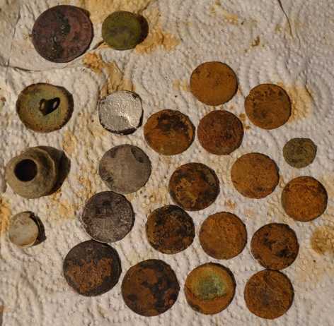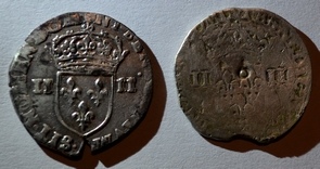 Bilan de cette sortie : 12 liards de France, 2 six deniers Dardenne, 2 trente deniers en billon, 1 douzain de Navarre en billon, un denier tournoi. Toutes les monnaies sont encroûtés d'oxyde ferreux (comme les monnaies carolingiennes de El Picton) et rien n'est vraiment nettoyé mais il y a peu d'espoir... Trouvé au cours de la même sortie : un sol à l'écu Louis XVI mort et un DT mort.