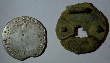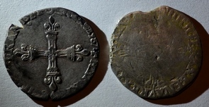 2 monnaies : 1/4 d'écu de Henri IV en argent quasi savo et 1 DT savo, j'ai aussi trouvé un objet en bronze qui est littéralement tombé en poussière à sa sortie de terre.