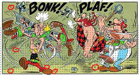 Pour les casques, pas possible de les retrouver, puisque Obélix les ramasse systématiquement pour sa propre collection. Je crois qu'il en a déjà un en main sur cette image.