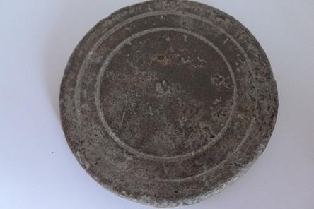 [1856] Légèrement tronconique. Diamètre à la base : 15 mm. Diamètre en surface : 13 mm.