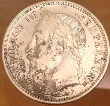 Quand je l'ai sortie, elle était trés patinée couleur sombre avec des reflets verdatres (style cuivre). J'ai donc cru au départ qu'elle était trés bien conservée mais ne pensais pas à de l'argent. C'est en regardant la tranche (rainures encore visibles) que j'ai pigé que sa matiére 1ere était du solide, et en grattant un peu la couleur blanche est apparue. A noter que toutes les napo que j'ai trouvé depuis 4 ans sont savonnettes +++