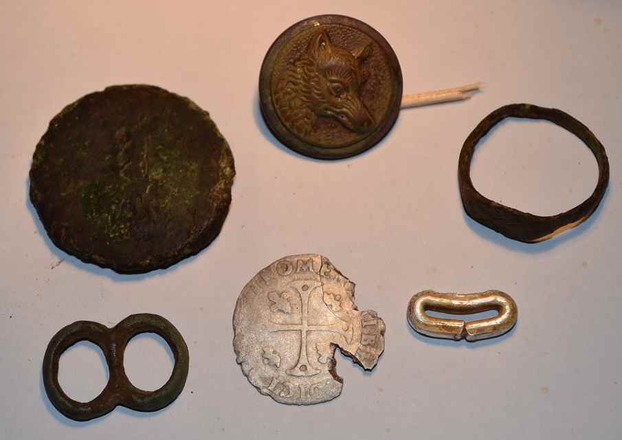 Sortie de 2h30 cet après midi en forêt du 27. Je teste le Deus pour la première fois et il ne m'a pas déçu. Ma première bague ancienne à identifier, un joli bouton, un sesterce en cours de nettoyage, une boucle et une monnaie genre douzain comme j'ai trouvé hier. Je n'ai pas mis la vingtaine de cul de cartouche car endroit très pollué par les chasseurs !