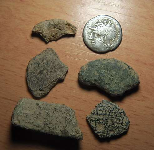 dolt71, sympa ta monnaie en argent de la République Romaine ! Il me semble toute fois que tes deux objets du milieu soit des restes de monnaies! Amicalement