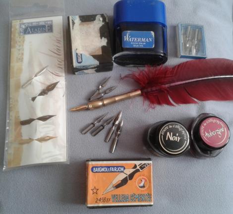 Voici mon matos, la plume et les petits encriers m'ont été offert par mes soeurs, qui savent que j'aime ça