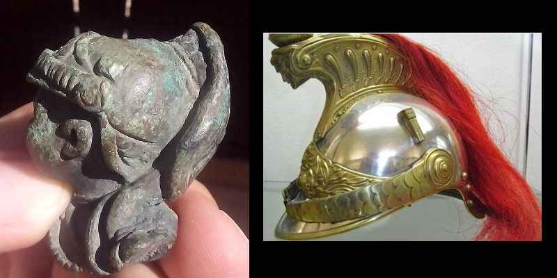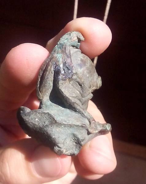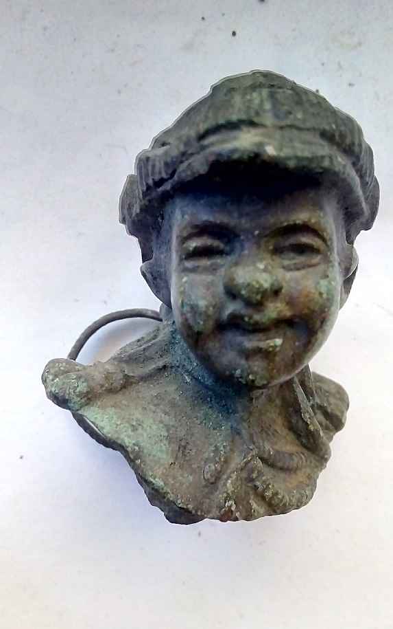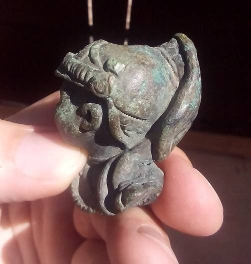 J'aimerai bien connaître l'utilité de cet objet à l'origine! J'ai tapé sur le net, quelques mots clés pour essayer de trouver, mais rien de concret ! La cassure de la fixation m'intrigue.... Buste décoratif qui était fixé sur quoi ? Pourquoi c'est-il retrouvé perdu dans la nature ? Suite à une cassure accidentelle ? Dans ce cas, il devait être fixé ou monté sur un support ( objet ) transportable ! Pour l'instant, je tente une proposition : peut-être un embout de garde d'épée ! Mais il peut y avoir plusieurs hypothèses !