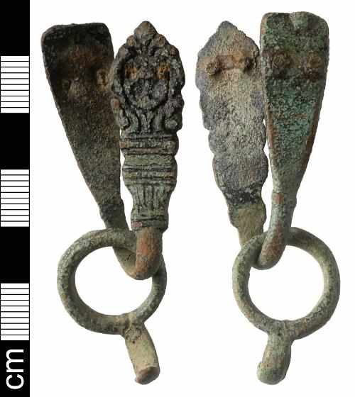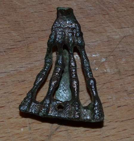 Une certaine similitude avec un élément de suspension d'épée (bien que je n'aie jamais vu ce motif ''en éventail''), XVIe-XVIIe. Cet objet est riveté au cuir de la ceinture.