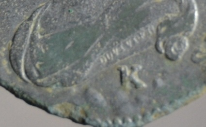 J'ai zoomé sur le bas du buste afin de montrer les différences de couleur entre les parties saillantes et donc usées ou le vert du bronze sous la pellicule d'argent ressort et les parties moins usées (signature du graveur)...