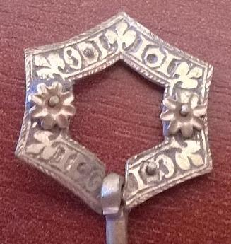 Voici, ci-dessous, un exemplaire trouvé sur le net, et dans le même genre que le tien, Maxence. Celui-ci serait du 15e ou 16e siècle. Il lui manque trois paillettes.
