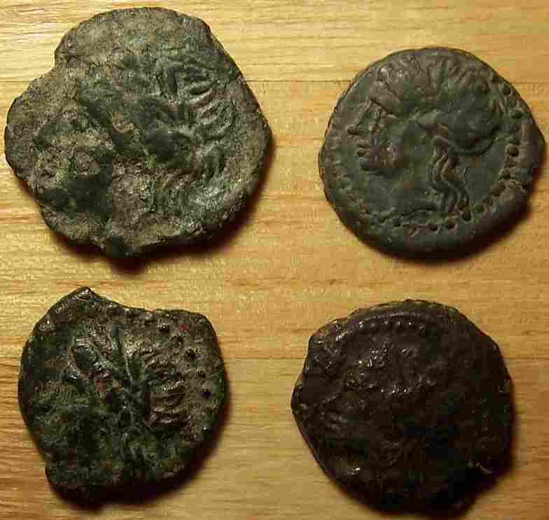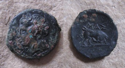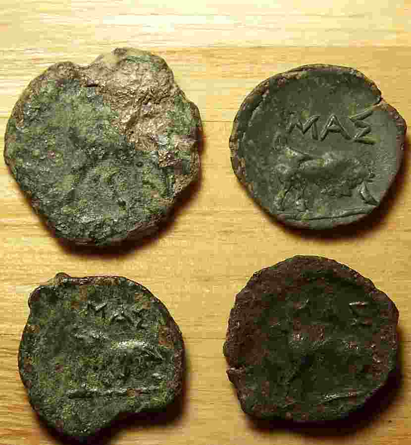 Quatre bronze, en haut Ă gauche un moyen bronze proche des 4gr., en haut Ă droite le bronze de ce post et les deux dessous avec mĂŞme lĂ©gende MAΣ et qui sont proche des 2gr. Sur le moyen bronze le motif avers et revers est plus grand correspondant au flan plus large de la monnaie, il y a une forte adjonction de plomb avec comme rĂ©sultat une dĂ©gradation de la monnaie dans le temps (j'ai mis un des plus beaux ) ce qui n'est pas le cas pour les trois autres petits bronzes (peut ĂŞtre un peu de fer dans celle en bas Ă droite...).