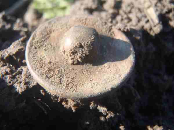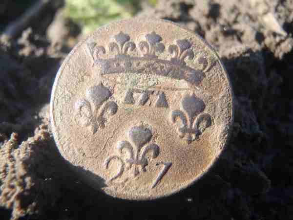 Trouvé hier ce magnifique bouton. Photo in situ, bouton non nettoyé ni pesé. Mais son diamètre doit faire environ 3cm.
