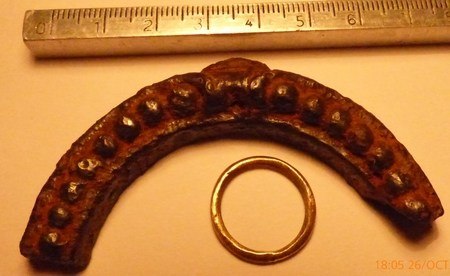 N'ayant malheureusement pas de réponse à cette demande d'identification je tente de faire remonter le post. Il s'agit d'un morceau de fer en forme d'arc probablement cassé et donc certainement ovale en entier. Il est légÚrement évidé (concave) sur l'envers.