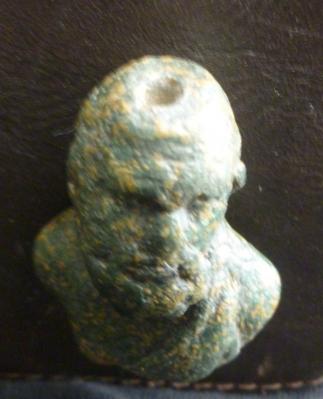 pouvez vous m'aider à identifier cet objet, trouvé dans le 04, il mesure 4cm de hauteur, et sous la patine verte apparait un métal gris /noir . au poids dans la main cela me fait penser à du plomb car l'objet est bien lourd par rapport à sa taille, mais vu la patine ça ressemble à du cuivre sur le dessus.. il y a un trou au sommet de sa tête.