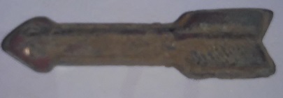 rebonjour voici une petite flèche je pence que c'est récent elle est en cuivre recouverte de laiton on dirait si quelqu'un a une idée de l'époque 3cm de long 0.3 cm de large
