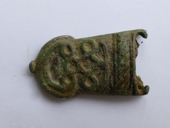 bonsoir a tous comme dit Vincent c'est une bouterolle vraisemblablement pour une ceinture médiévale car beaucoup faisaient +- 25 mm de large sur R0 on voit à droite comme le départ d une boucle et en R1 à gauche un reste de rivet