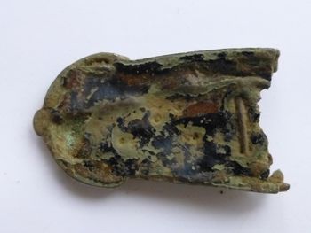 Juste une précision, on dirait que le métal est verdâtre mais il est blanc plutôt brillant par endroits avec des restes émaillés noirs et rouges sur les deux faces. L'objet devait donc être coloré à l'époque