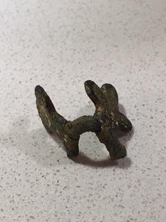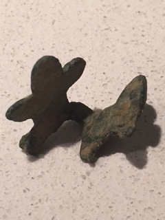 Ils sont en bronze avec un restant de dorure, ils font 2 cm de hauteur pour 3 cm de largeur et 0.2 cm d'épaisseur.Trouver dans un champ de Seine et Marne.