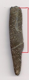 je vous soumets un objet en bronze de 10 centimètres de long et un centimètre dans sa + grande largeur trouvé dans un labour en Charente et dont la partie indiquée en rouge est aiguisée comme une lame de couteau ou un coupe-papiers (j'ai essayé ça coupe très bien)