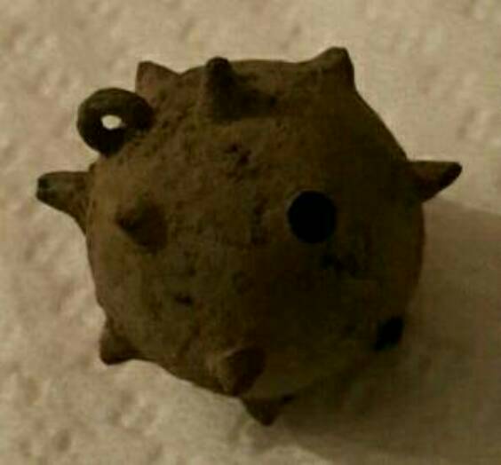 voici ce nouvel objet à identifier petit pendentif un peu bizarre ou autre chose mais je ne sais vraiment pas quoi très léger et creux il mesure 1,8 mm de diamètre merci d'avance je compte sur vous