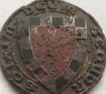 trouvée cette rondelle fine en cuivre colorée avec un blason diamètre 24 mm incurvée sur le revers dans un champ du 62