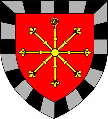 'De gueules à une escarboucle pommetée et fleurdelisée d'or, la branche du milieu terminée en chef par une crosse du même ; à la bordure componée d'argent et de sable.'
