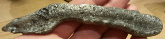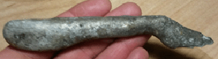Voici un curieux objet en aluminium de 13 cm. J'ai d'abord cru a une concrétion métallique issue d'un feu mais je trouve que ça ressemble étrangement a une sorte de scalpel ou couteau avec un manche et une sorte de lame. L'alu était-il travaillé jadis ?