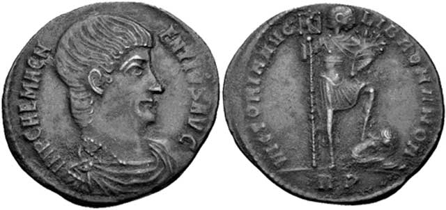Rev : VICTORIA AVG LIB ROMANOR, RP à l’exergue, l’empereur debout à droite, le pied sur un captif assis à terre, tenant rameau et étendard.