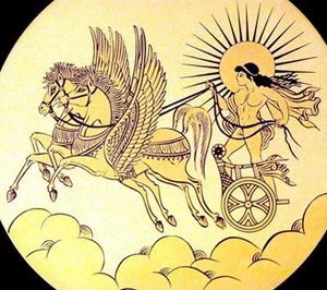la représentation est ressemblante, Apollon dans sa '2 chevaux'!