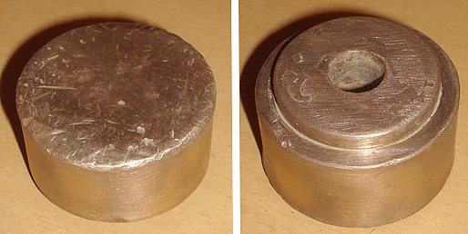 Avez vous, s'il vous plait , une idée de la fonction de ce cylindre en laiton de 40 mm de diamètre et 25 mm d'épaisseur qui apparemment a servi d''enclume' sur une de ses faces ?